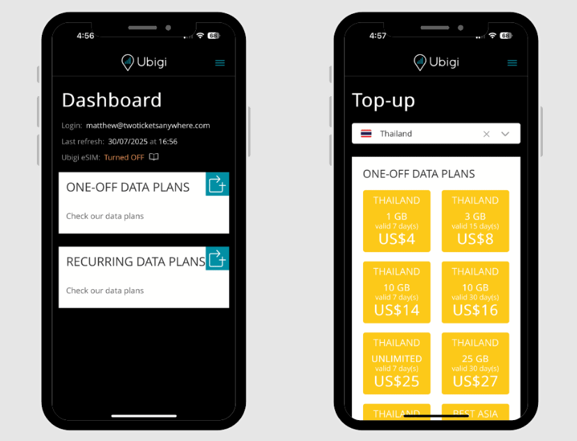 Rechargez votre forfait où que vous soyez : Rechargez facilement via l’application Ubigi, même sans Wi-Fi ni données mobiles, et restez connecté tout au long de votre voyage.